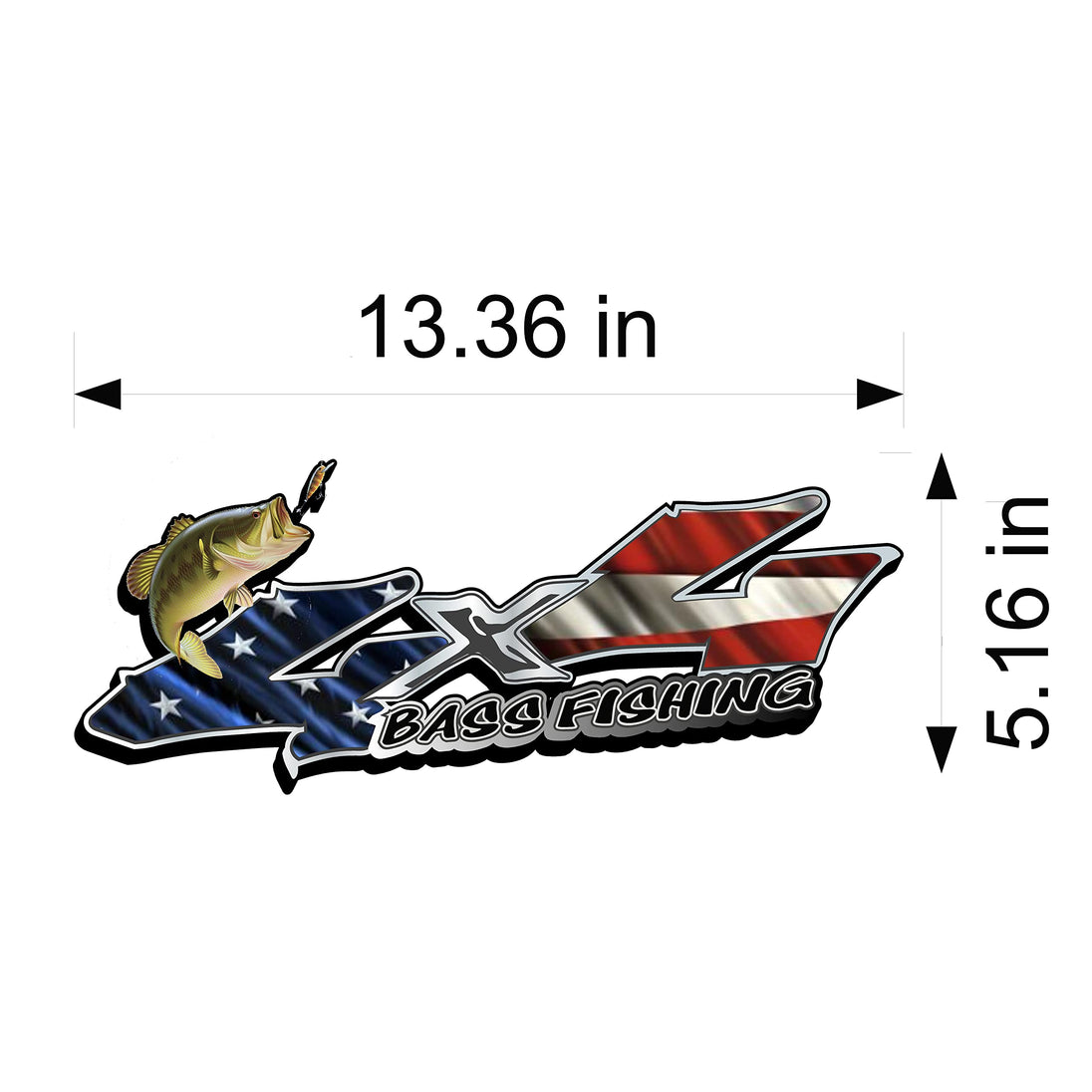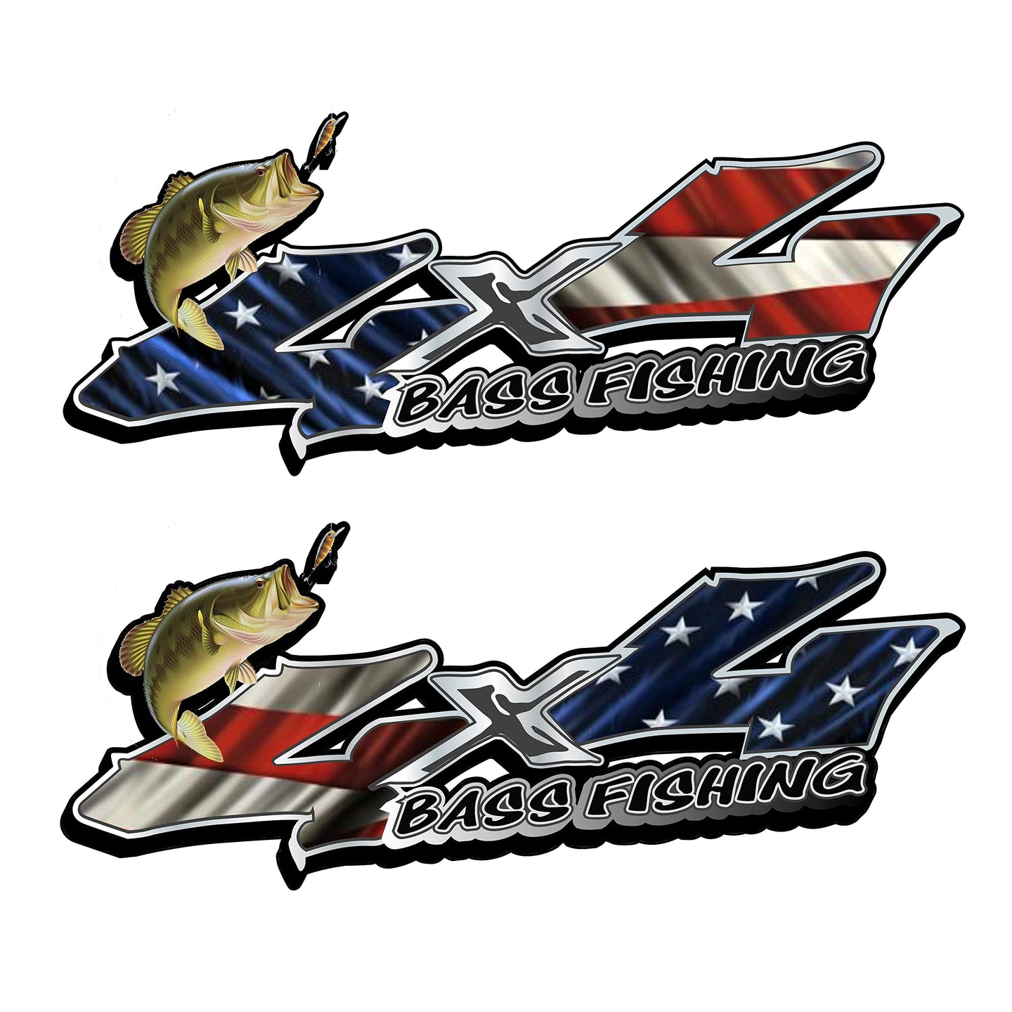 American Flag Bass Fishing 4x4 Patriotic bedside decals comes in a set of two a right and a left. the size on each decal is 13.5" long x 5.3 tall They can be placed on any Flat Surface (ex:Car & Truck Windows,laptops,cups,Laptops,coolers and more) Easy to apply air release vinyl Peel and stick application will last for years.